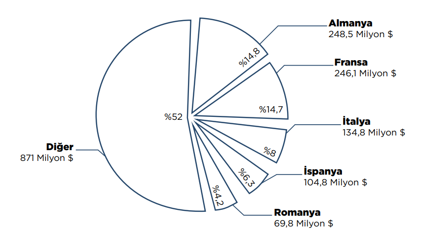 Türkiye’nin ihracatında en büyük ticaret ortağı %43 pay ile Avrupa Birliği olmaya devam etti. Ülke bazında değerlendirildiğinde ihracatta Almanya ilk sırada yer aldı. Almanya’yı ABD ve İngiltere, ardından İtalya ve Fransa takip etti.
