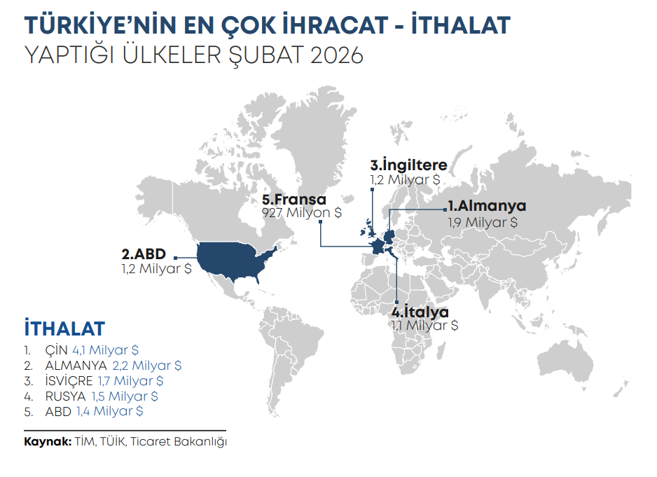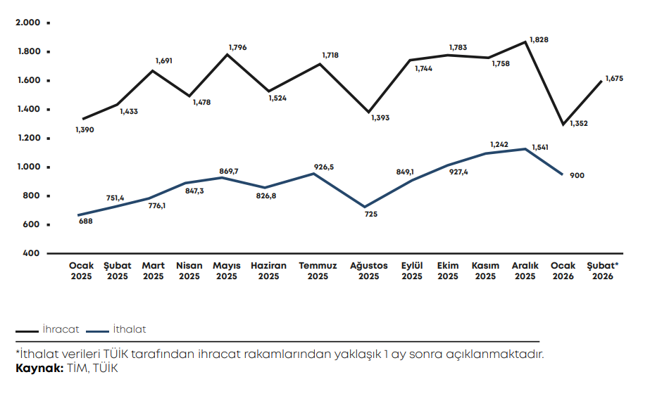 Şubat ayında ithalat geçen yılın aynı dönemine göre %6,1 artarak 30,3 milyar dolar seviyesinde gerçekleşti. Böylece aylık bazda dış ticaret açığı 9,2 milyar dolar oldu. İthalattaki artışın önemli bir bölümü altın ve gümüş ithalatındaki yükselişten kaynaklandı. Ocak-Şubat döneminde toplam ithalat 59 milyar dolar olarak kaydedilirken, aynı dönemde ihracatın ithalatı karşılama oranı %70,2 oldu. Türkiye’nin dış ticaret hacmi ise yılın ilk iki ayında yaklaşık 100 milyar dolar seviyesinde gerçekleşti.
