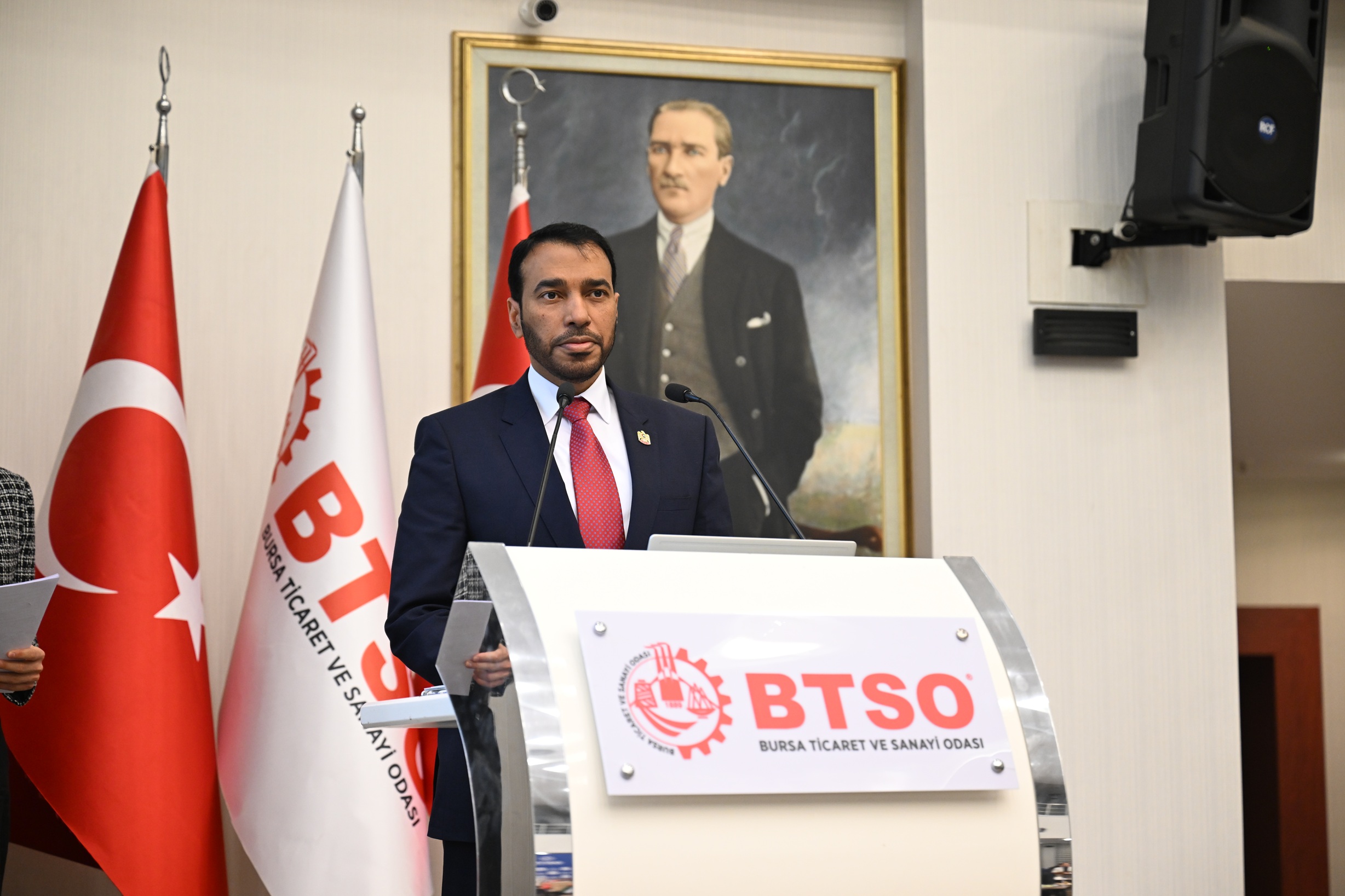 Birleşik Arap Emirlikleri Ankara Büyükelçisi Saeed Thani Hareb Al Dhaheri, Bursa’nın tarihî dokusu ile modern sanayi ve tarımını birleştiren yapısından övgüyle bahsederek, “Bugün, güzel Bursa şehrinde sizlerle olmaktan büyük mutluluk duyuyorum. 2024’teki verimli ziyaretin devamı olan bu program, iki ülke arasındaki ticaret köprülerini güçlendirecek.” dedi. BAE ile BTSO arasındaki iş birliğinin önemine dikkat çeken Al Dhaheri, “Bu buluşma, Büyükelçiliğimiz ile BTSO’nun yapıcı iş birliğinin bir sonucu. Amacımız, tarım ve gıda sektörlerinde yeni fırsatlar oluşturmak.” diye konuştu.