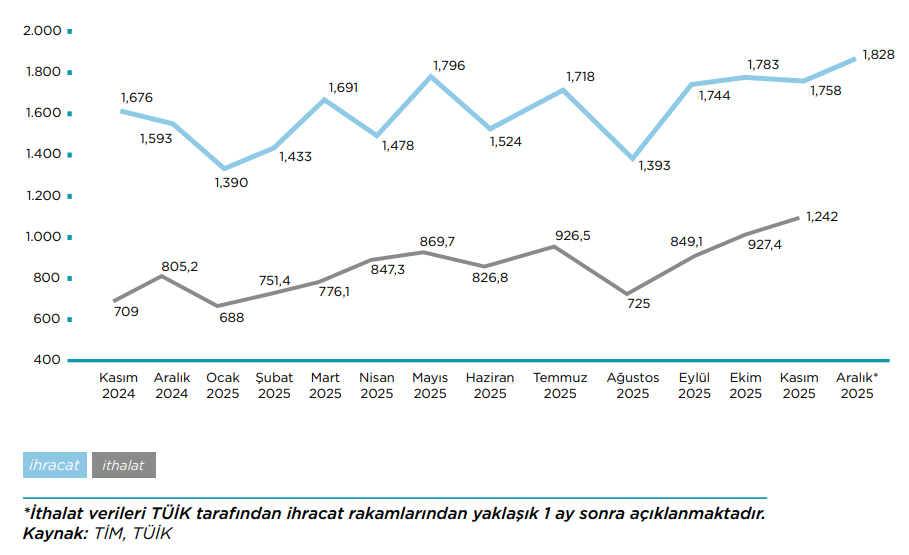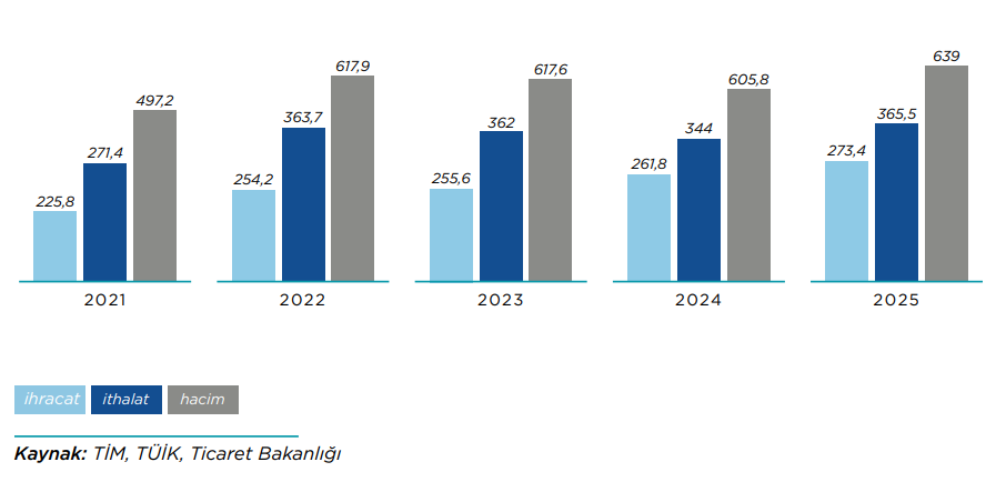 İthalat 2025 yılında 365,5 milyar dolar olarak gerçekleşti. İhracatın ithalatı karşılama oranı yüzde 74,8’e yükseldi. Cari işlemler açığının milli gelire oranının yıl sonunda yüzde 1,4 seviyesinde olması bekleniyor.