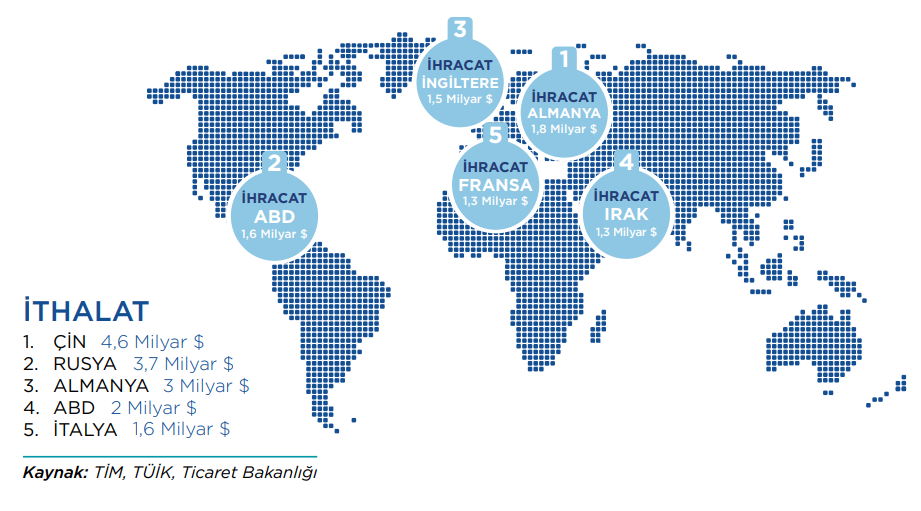 Bursa’nın ilk 5 ülkeye yaptığı 8,7 milyar dolarlık ihracat toplam Bursa ihracatının %44,8’ine karşılık gelmektedir.